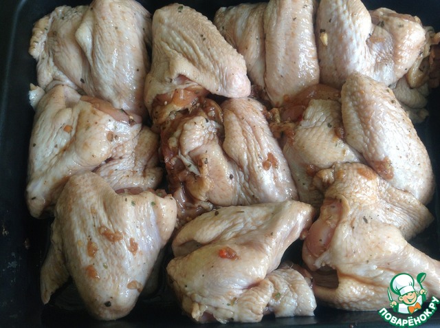 Вместе с маринадом выложить в смазанный оливковым маслом противень куриные крылья и отправить в духовку на 30-40 мин при 180 гр