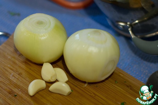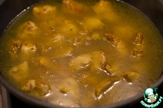 Вскипятив воду в чайнике, добавляем кипяток в курицу, пока она не покроет её.