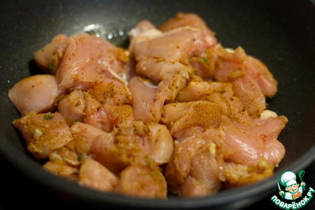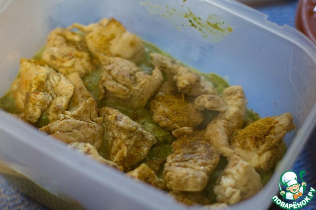 Затем в посуду выкладываем слоями курицу без бульона, приправляем специей для сациви, и орехово-пряный соус. Пусть пропитаются ароматами.