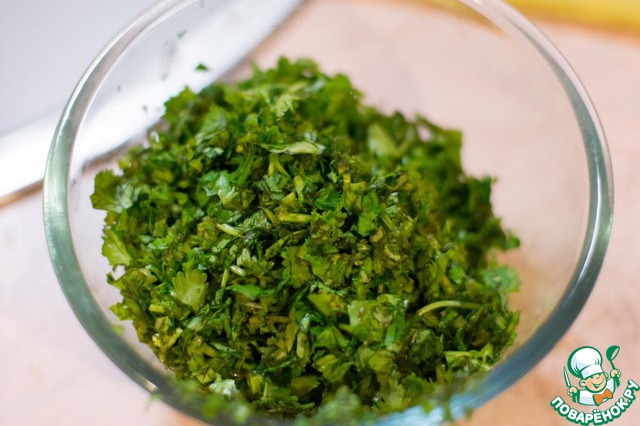 Прокручиваем кинзу и орехи через мясорубку, но у меня её нет, поэтому я порубила зелень.