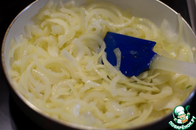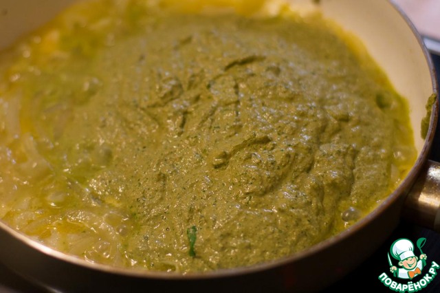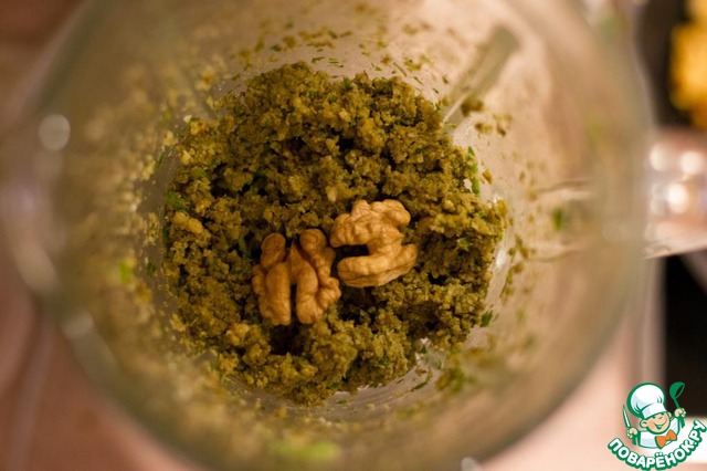 Часть бульона добавляем в лук. Я часть оставила, и всё таки в блендере порубила орехи с зеленью при помощи бульона. Этот соус выливаем к луку.