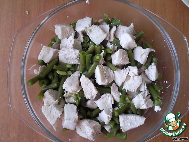 Выкладываем в форму курицу и фасоль, перемешиваем.