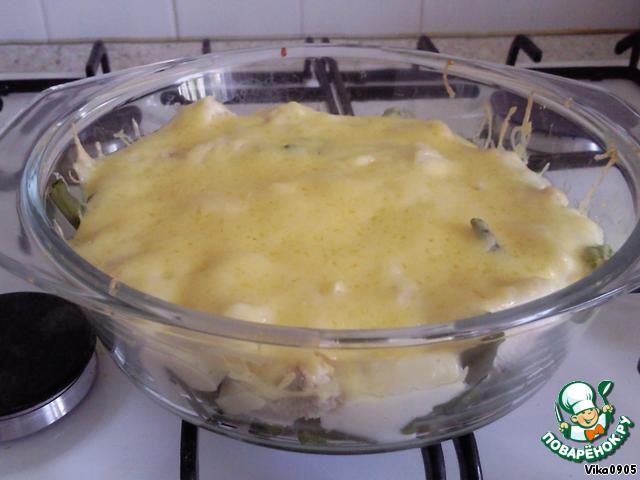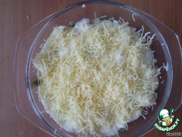 Сверху засыпаем сыр и ставим в духовку 150 градусов, на 20 минут, чтобы сыр расплавился.