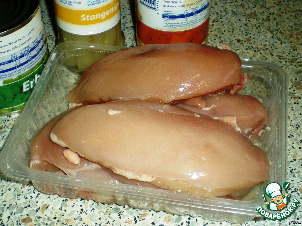 Отварить грудку, порезать кубиками. Остальные ингредиенты, также порезать.
