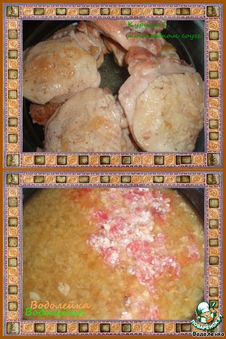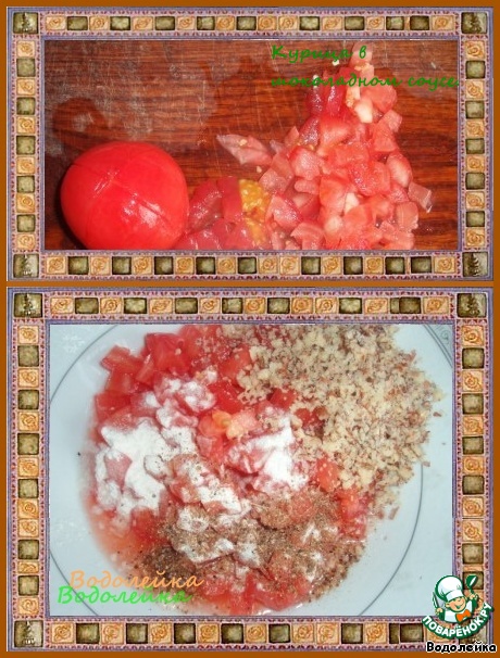 И готовим наш соус. В кастрюлю, где тушилась курица, добавляем помидоры, перемешанные с мукой, орехами и кориандром, перемешать и протушить около 5 минут. На этом этапе пробуем соус на вкус и добавляем соль, перец.