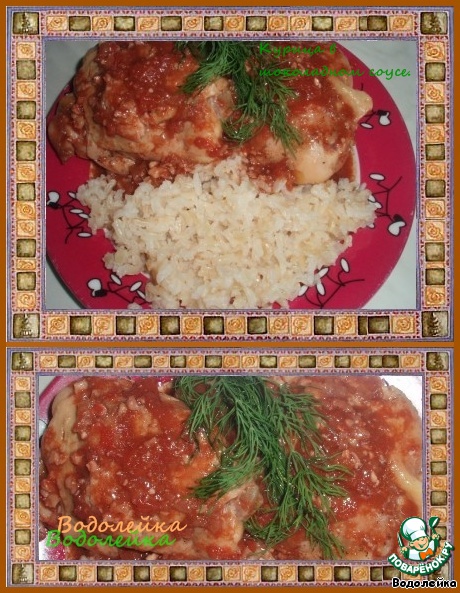 Выкладываем куски курицы на блюдо и поливаем соусом.