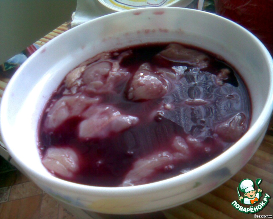 Сложим наши филешки в глубокую посуду и зальем вином. Оставим часа на полтора-два. Оговорюсь сразу, время можно и уменьшить, просто я не торопилась.