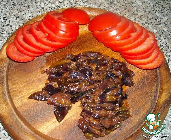 Предварительно замоченный чернослив нарезала полосками (у меня, наверное, перележал и поэтому получился очень уж мягеньким!) и помидоры нарезала шайбами.