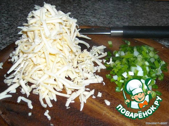 Пока они там зажаривались, натерла плавленный сыр на крупной терке (плавленный взят из экономии, стоит 1 штука/80 грамм всего 10 рублей, но вы можете и Маасдамом посыпать!!!), нарезала зеленый лук