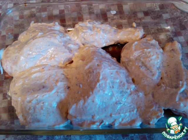 Курицу со всех сторон обмазываем соусом. Можно сразу ставить в духовку, а можно оставить помариноваться. И даже оставить в холодильнике на ночь.
