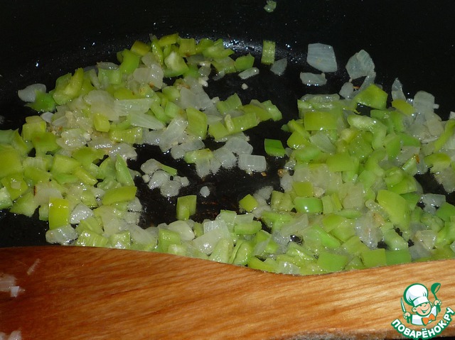 Лук и чеснок измельчить, обжарить на растительном масле до мягкости. Перец мелко нарезать и добавить в сковороду к луку и чесноку, продолжать жарить около 3 минут.