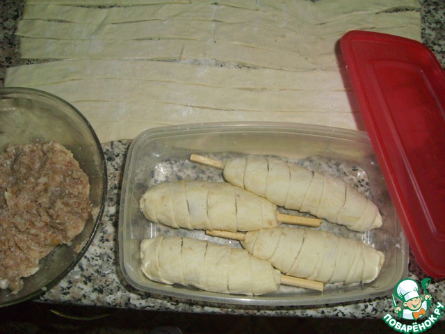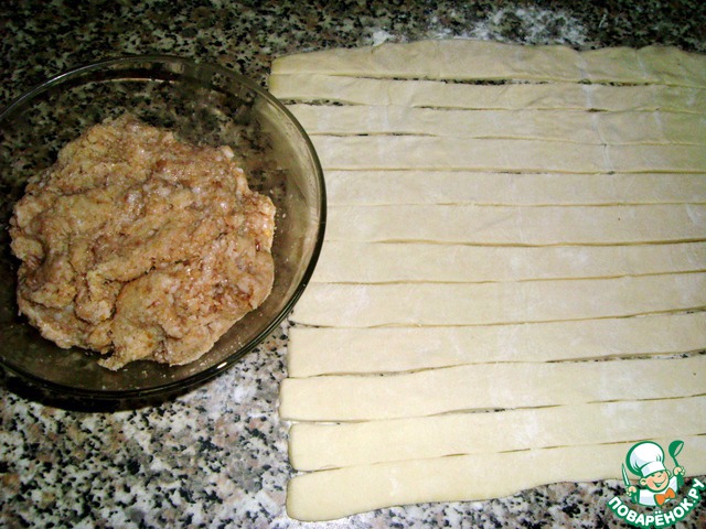 Тесто раскатать толщиной 1 мм и нарезать полосками шириной 2 см.