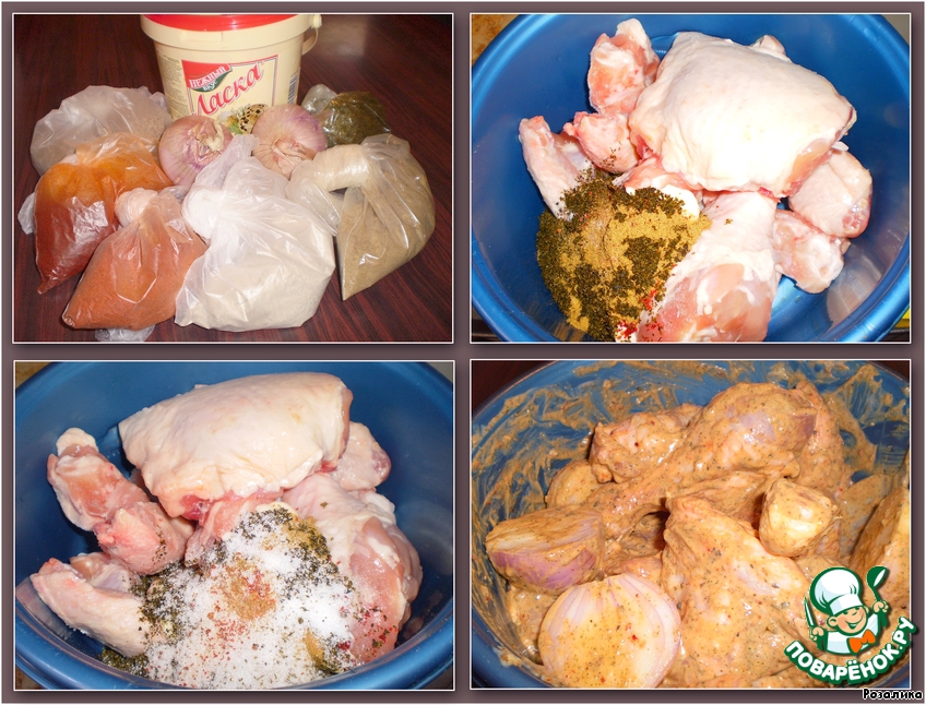 Куриные бедрышки отделить от ножек, положить в тазик или кастрюлю добавить специи, посолить, поперчить. Все перемешать.