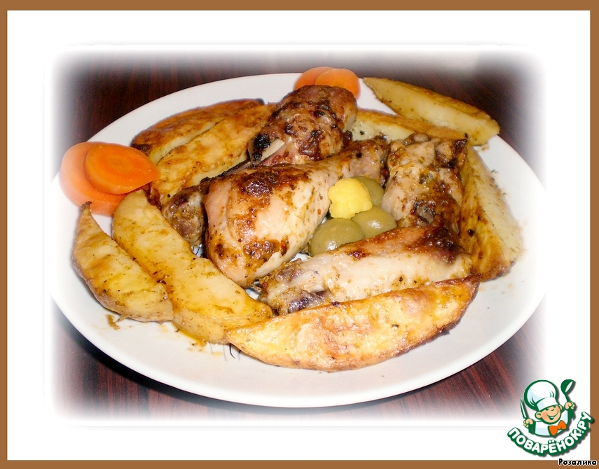 Сверху разложим куриные бедра и ножки. В маринаде от курицы картофель и нарезанный лук хорошо перемешаем. Разложим картофель и лук между курицей. Поставим в печь и запекаем при T=200гр 60-90 минут до золотистого цвета.