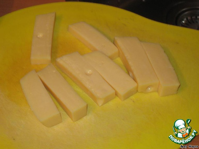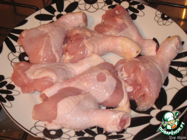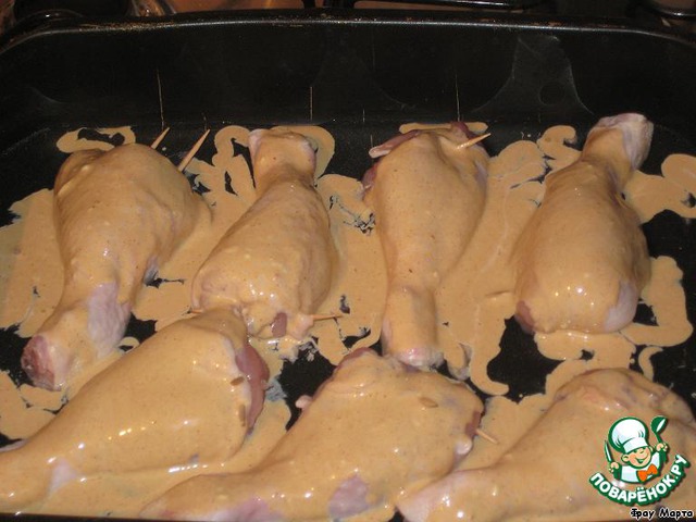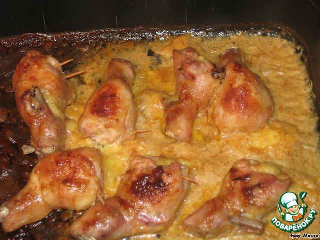 В каждую голень положить кусочек сыра и скрепить зубочистками (можно зашить, если хотите).
