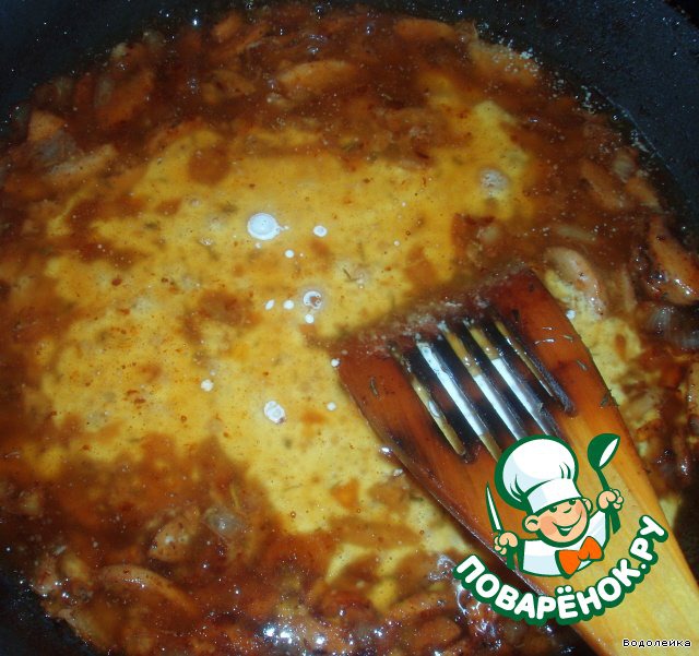 Остальное вино (где-то половина бутылки) вливаем в соус и хорошо перемешиваем.