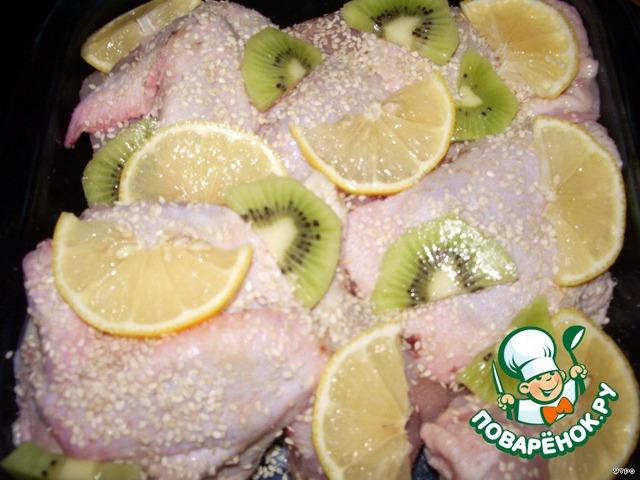 Разделываем тушку на порционные кусочки, солим, перчим, укладываем в форму и основательно посыпаем кунжутом.