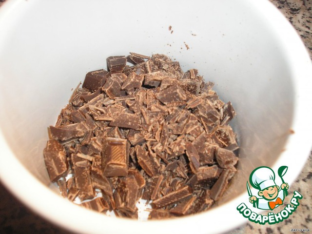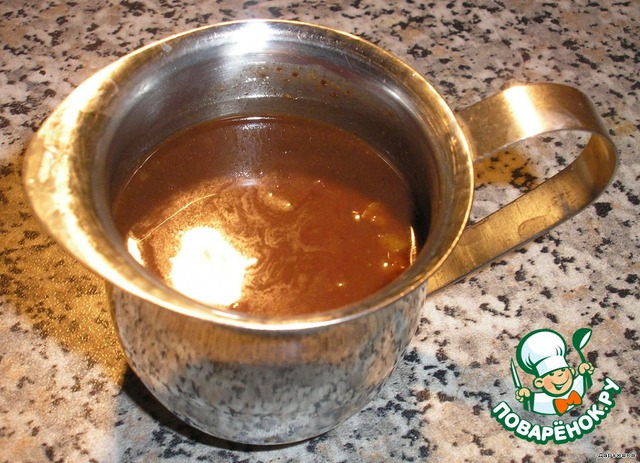 Приготовим соус. Смешиваем сок, который слили из формы, шоколад. Подогреваем на тихом огне, чтобы растворился шоколад. Добавляем коньяк. Перемешиваем.