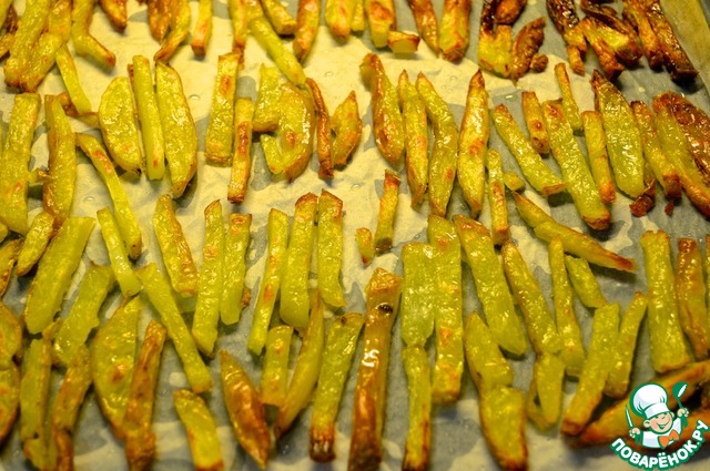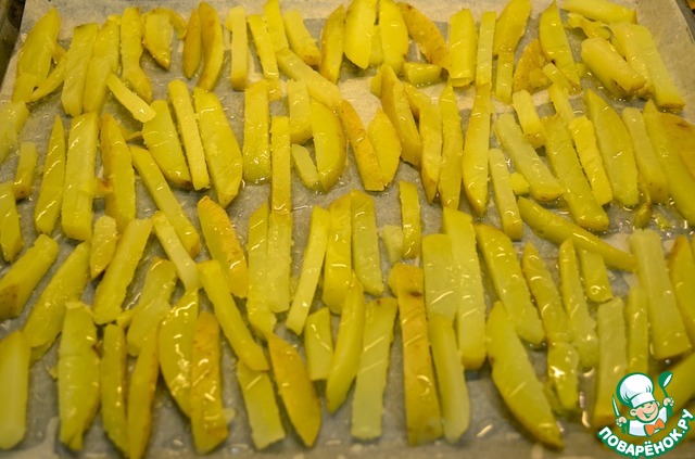 1. Разогреть духовку до 220С. Картофель порезать на длинные тонкие палочки (толстой соломкой) и бросить в кипящую воду. Отварить 2 минуты, слить воду и высушить на бумажных полотенцах.