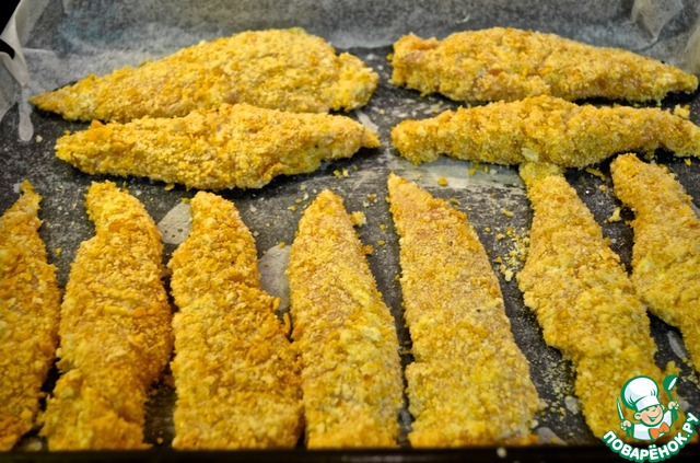 4. Хлопья положить в пакет и прокатать их скалкой, чтобы получилась крошка. Кусочки куриного филе обвалять в майонезе, а потом в смеси панировочных сухарей, крошки, соли и перца.