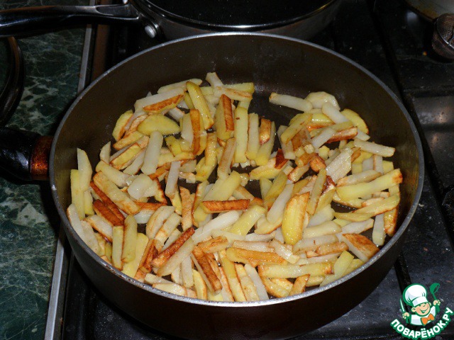 Картофель очистить, нарезать брусочками и обжарить почти до готовности, посолить.
