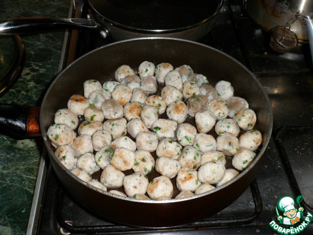 Из фарша скатать фрикадельки размером с черешню и обжарить их.