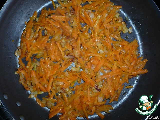 Мелко нарезаем лук, натираем на терке морковь. Лук и морковь обжариваем на растительном масле.