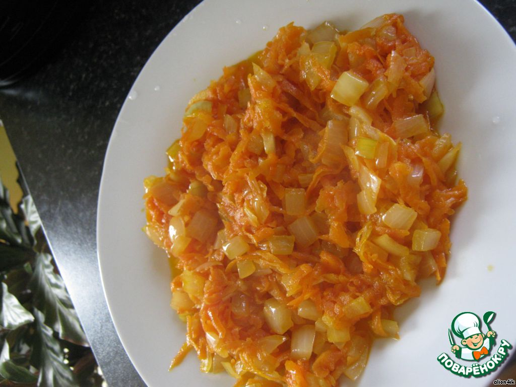 Морковь натереть на крупной терке. Лук нарезать четвертинками. Выложить все в сковороду с подсолнечным маслом и обжарить до золотистого цвета.