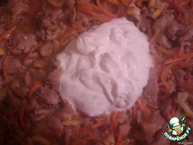 К мясу добавляем лук+морковь, лимон, чеснок, соль и сметану, перемешиваем и тушим под крышкой минут 7-10. За это время по квартире распростаняется тааакой аромат, что у всех домашних начинают течь слюнки))