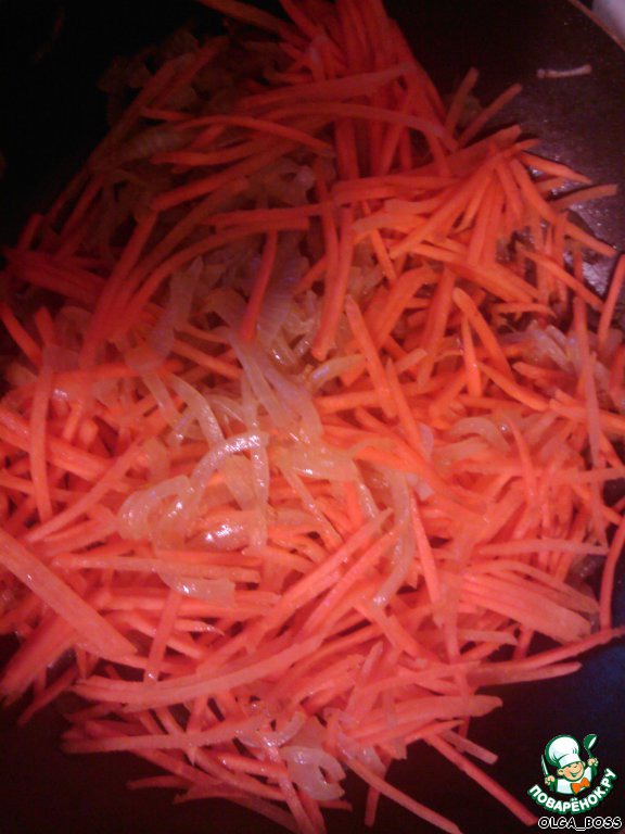 Моем, чистим, нарезаем соломкой или натираем на терке морковку, добавлем к луку и еще обжариваем пару минут.