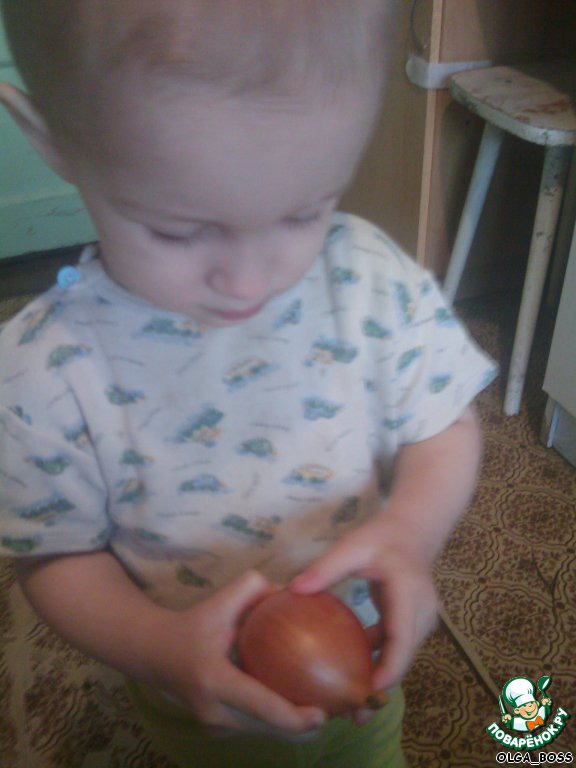 Подготавливаем овощи. Забираем у Главного помощника лук, чистим, нарезаем полукольцами, обжариваем до золотистости.