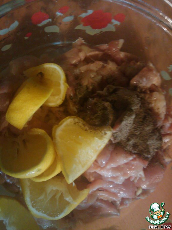 Выжимаем из половины лимона сок, заливаем им куриное мясо. Добавляем душистый перец, все перемешиваем и оставляем в покое помариноваться.