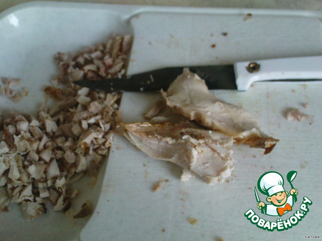 Снимаем шкурку с курочки, довольно мелко нарезаем