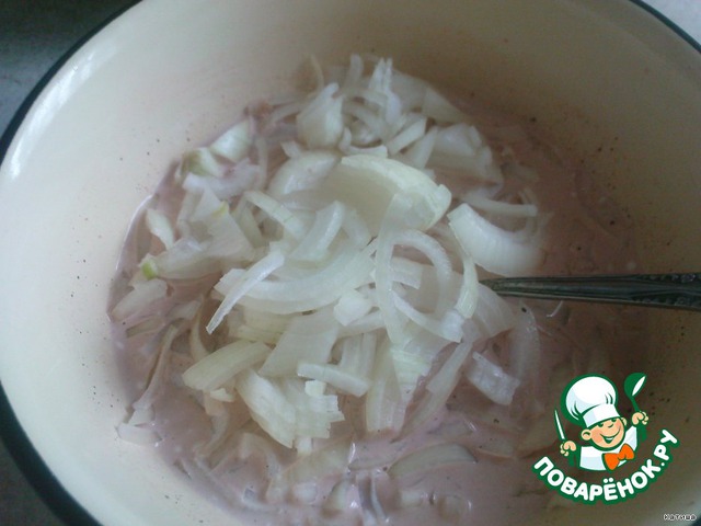 Нарезав на тоненькие четверть-кольца, выкладываем в заливку. Затем перемешиваем.
