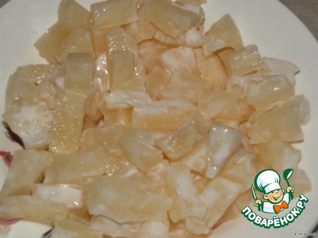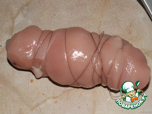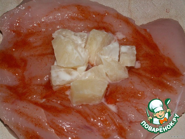 Мясо с одной стороны смазать смесью из приправы и ананасового соуса, положить подготовленные ананасы, скрутить рулетом и замотать ниткой (у меня для этого есть капроновая нить).