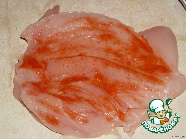 Грудки разрезать посередине, потом сделать надрез вправо и влево, раскрыть мясо, чтобы у вас получился пласт. Посолить с двух сторон.