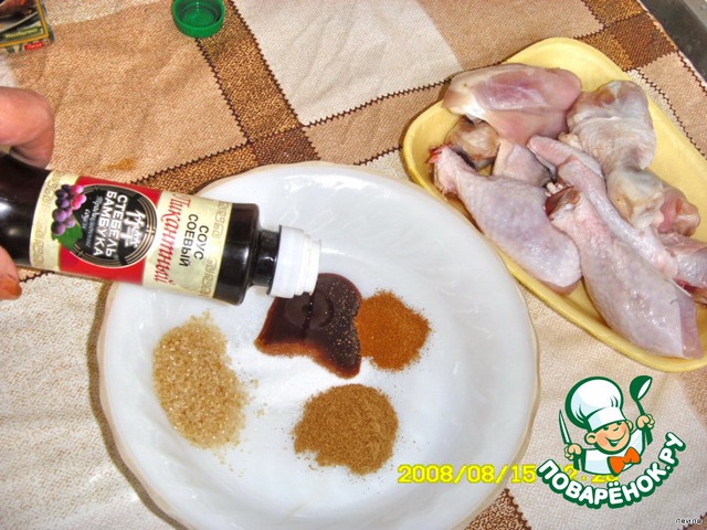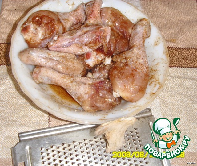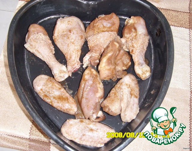 обмазать форму маслом, выложить окорочка, положить в духовку приблизительно на 30 минут, перевернуть один раз.
