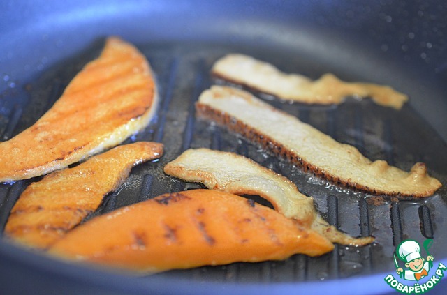 Тыкву и шпиг нарезать длинными полосками и обжарить на сковороде -гриль (3 мин.)
