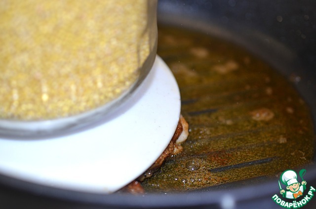 Убрать шпиг и тыкву со сковороды, на их место уложить окорочка. Накрыть тарелкой и придавить прессом (у меня в роли пресса выступила банка с крупой.) Жарить на среднем огне примерно 10 минут с одной стороны, перевернуть, смазать чесноком, выдавленным через пресс и жарить 10 минут с другой стороны. За это время мясо успеет прожарится (оно же без кости!). Возможно даже меньше по времени.