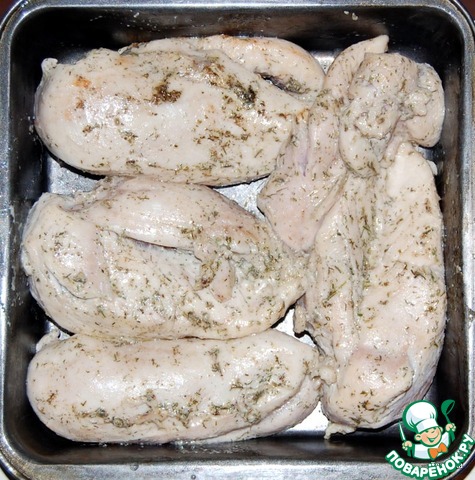 Теперь очередь курочки: слегка обжариваем филе с двух сторон. Именно слегка, никакой румяной корочки, каждую сторону буквально по минутке-две!