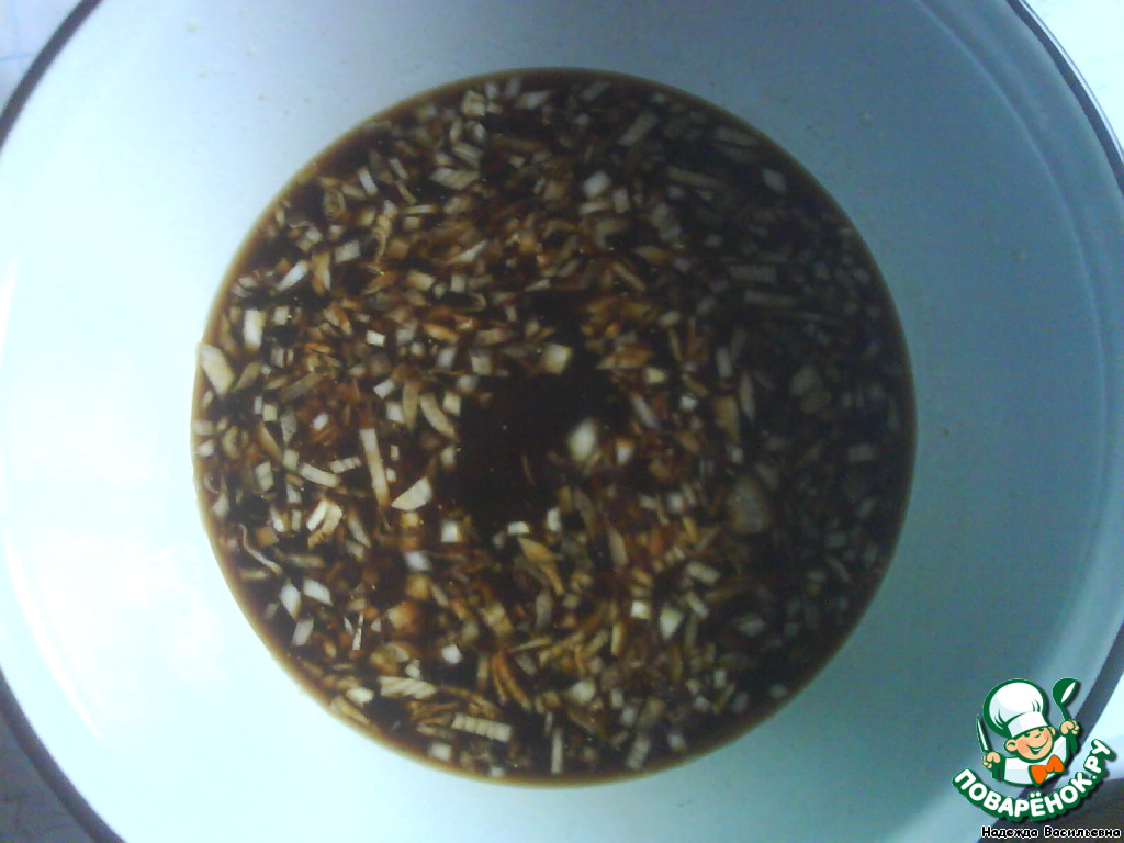 [b]Готовим маринад:[/b] Смешать вино, соевый соус, имбирь, измельченный лук и чеснок