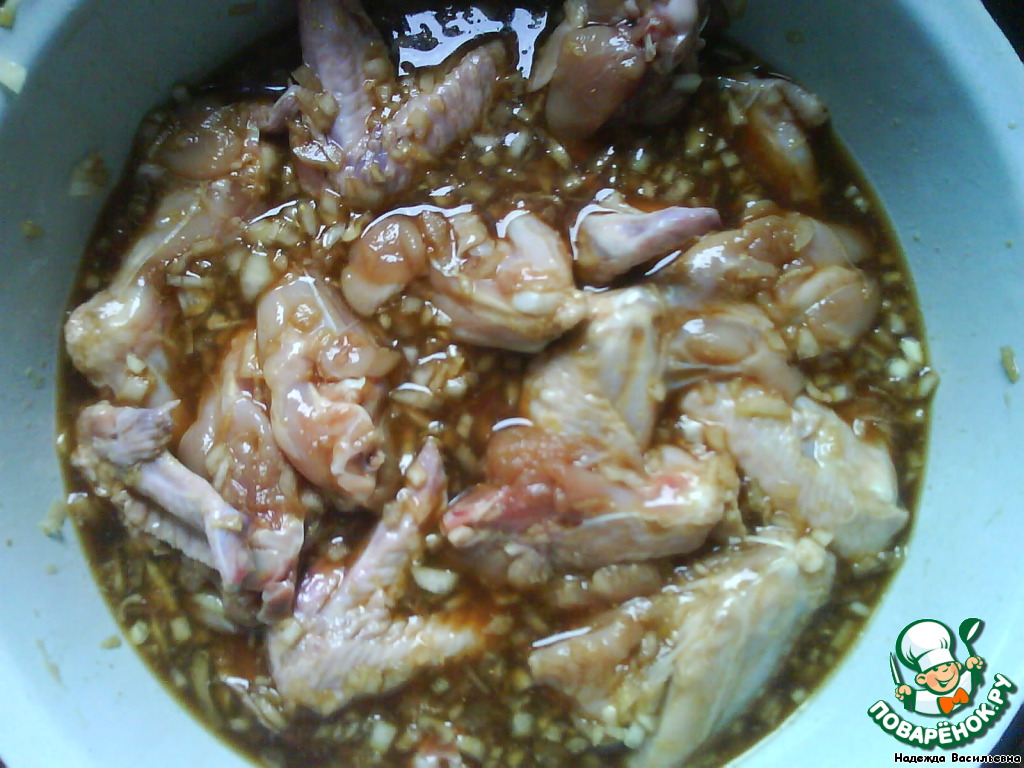 Залить крылышки получившейся смесью, посолить, хорошо перемешать, закрыть, поставить на ночь в холодильник.