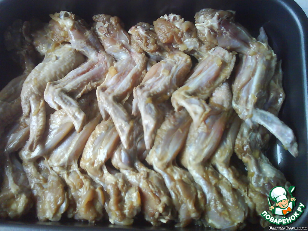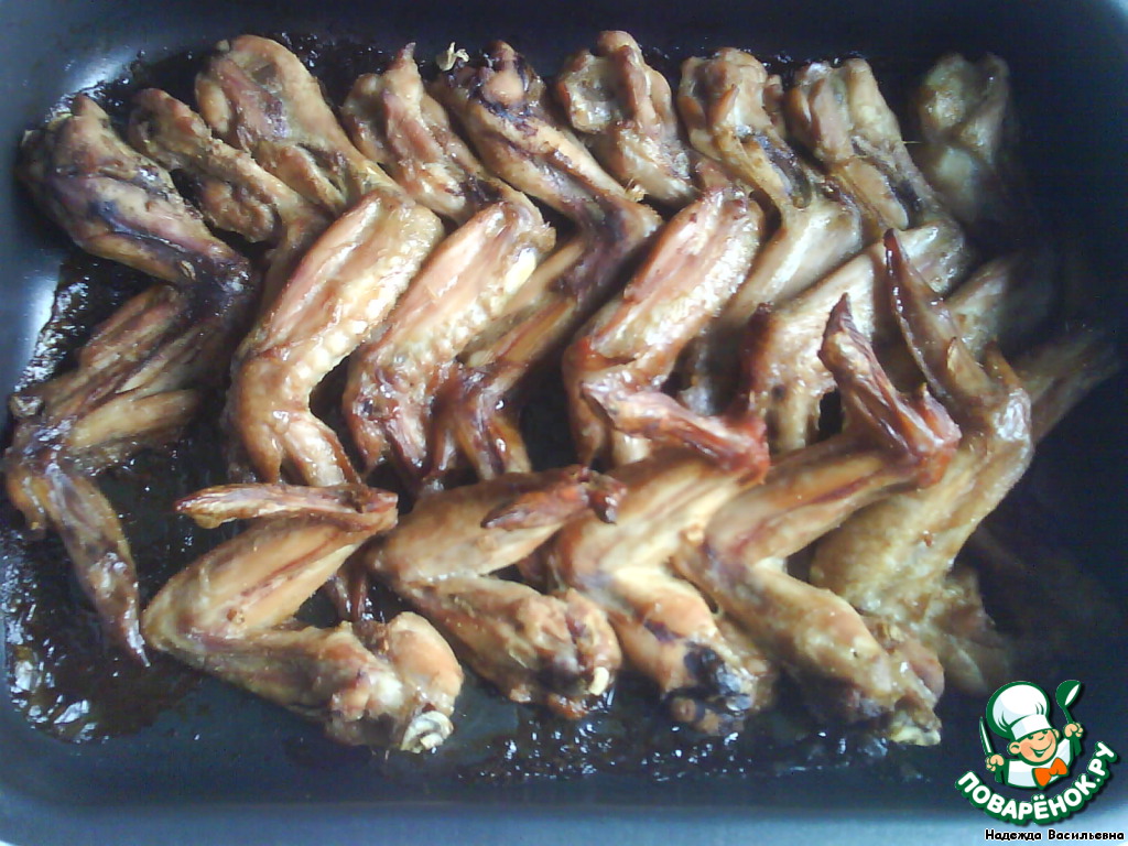 Достать крылышки из маринада, обсушить, выложить на смазанный маслом противень и поставить в духовку, довести до готовности ( я держала при 180 градусах ~ 50 мин).