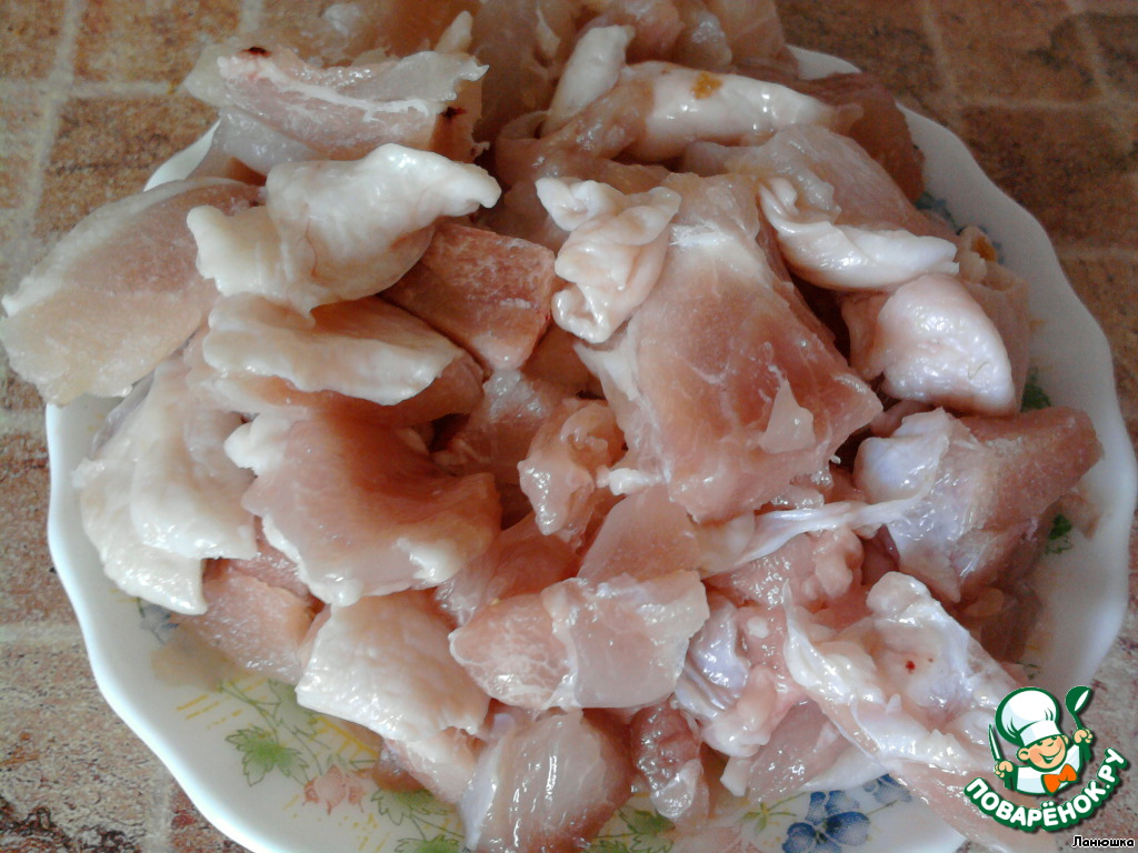 С куриного окорочка снять мясо, порезать небольшими кусочками и слегка обжарить на оливковом (растительном) масле.