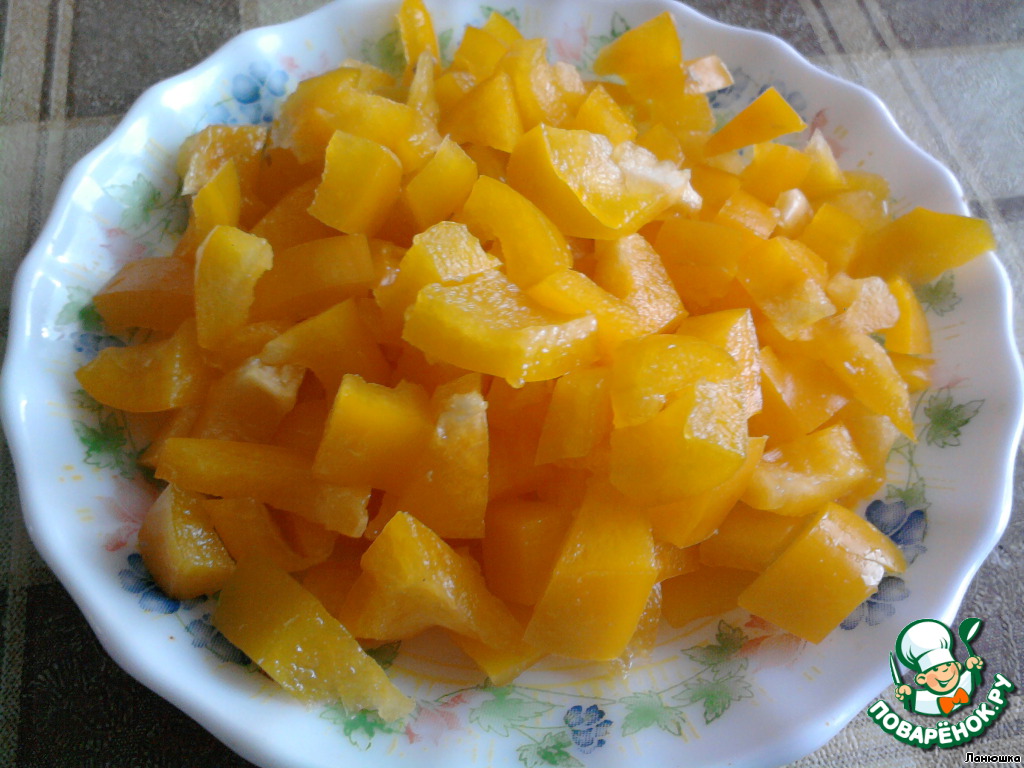 Пока обжаривается курочка, из болгарского перца удалить семена, нарезать кубиками, выложить на сковороду к курице.
