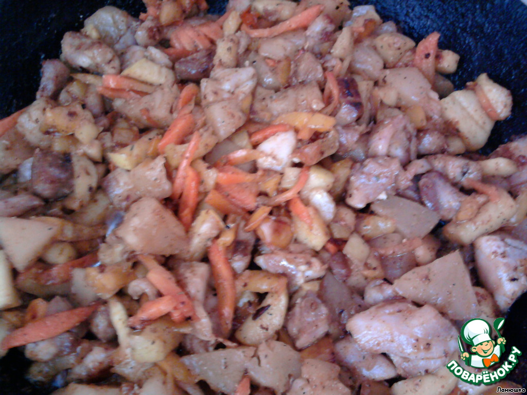 Морковь нарезать соломкой и обжарить с курицей и перцем.