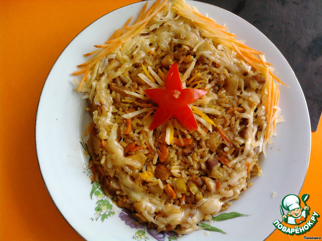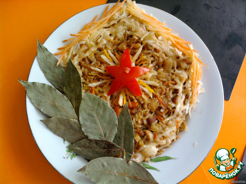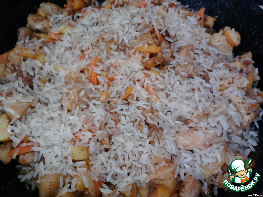 Засыпать рисом, добавить немного воды, накрыть крышкой и тушить еще минут 10-15.