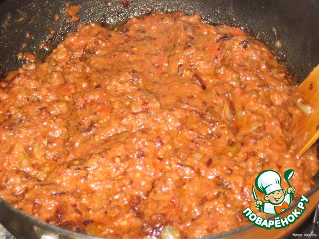 Пока курица тушится, лук мелко режем, морковь на крупную терку и обжариваем овощи на сливочном масле. Когда овощи зарумянятся добавляем томат, немного прокипятить. Добавляем перец и муку, аккуратно перемешиваем и выключаем.