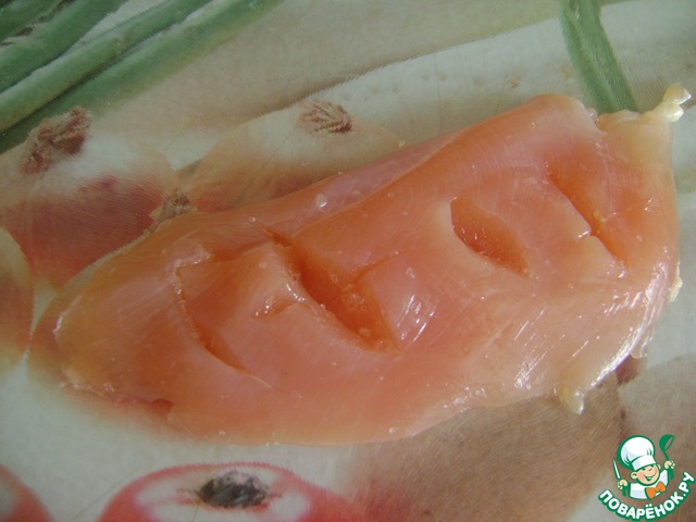 Филе куриной грудки на по-полам вдоль разрезать. Чтоб у нас из одного куска, получилось два тонких. Сделать насечки ножом, посолить поперчить, натереть чесноком пропущенным через чеснокадавилку. Сложить куски филе друг на друга.