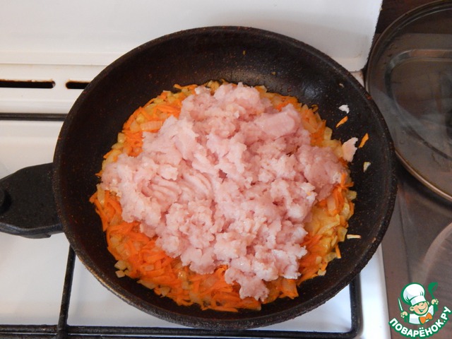 Тем временем фарш готов, добавляем туда болгарский перец и томатную пасту и тушим ещё 5 минут.